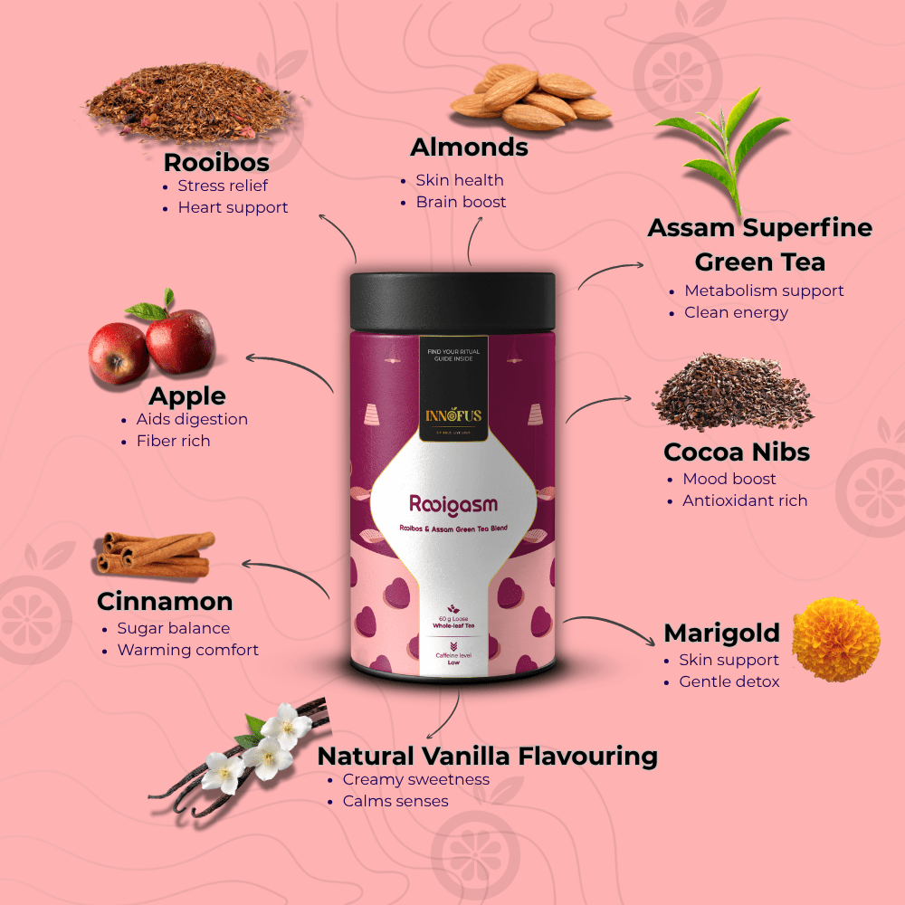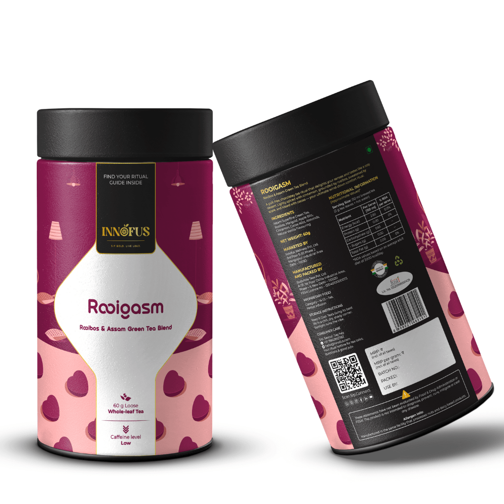 Rooigasm blends antioxidant-rich rooibos, energizing green tea, and indulgent notes of cocoa, cinnamon, and vanilla. It’s your guilt-free pleasure that satisfies cravings and supports your body, all in one crave-worthy cup.
