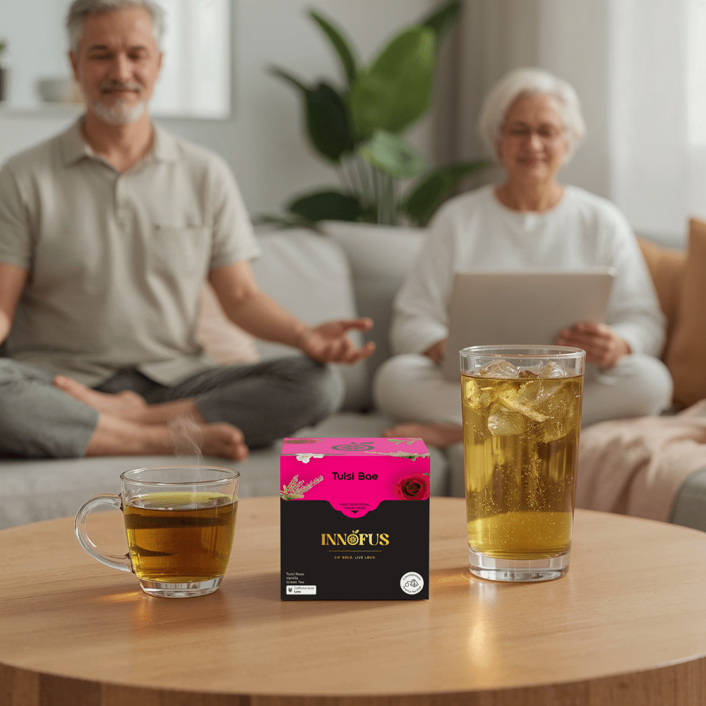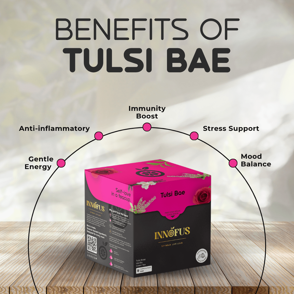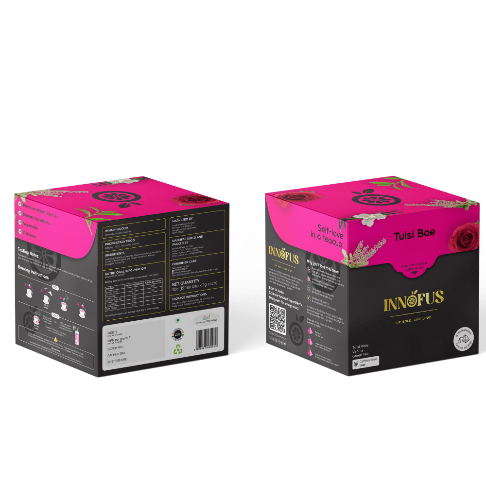Fragrant rose petals drift into sacred tulsi calm, then velvet vanilla wraps it all in a dreamy finish. It’s your aromatic tea meditation with a playful InnoFus twist.